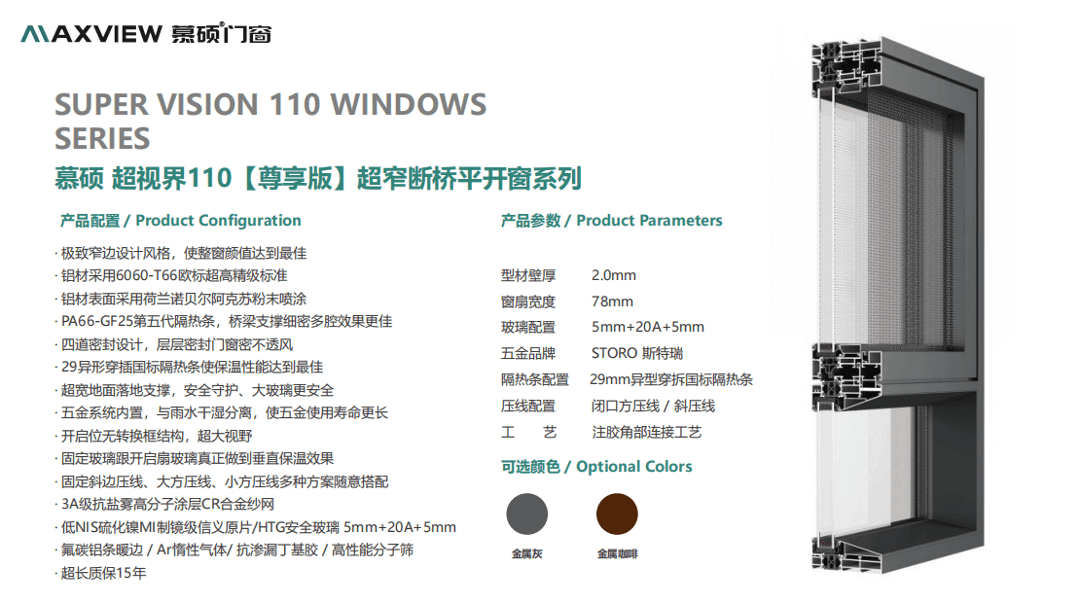 此次发布的慕硕超视界110【尊享版】超窄断桥平开窗系列,更是集匠心工艺与高端配置于一身,6060-T66欧标超高精级铝材、29mm异型穿插国标隔热条、四道密封设计等核心配置,搭配注胶角部连接工艺,让产品兼具颜值、性能与安全性,成为沿海门窗定制的优选之作。